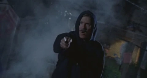 So Sidney climbs into his Ford SUV, and drives into San Francisco. He parks his car in a back alleyway. Once there, he puts on a false mustache and black sweater, and hides behind a dumpster. Meanwhile, ex-cop Archie Modine and his date exit a movie theater and walk across the parking lot, looking for their car. Just as they're starting to search, Sidney steps out with a knife in hand and says "Give me your money. Don't be a hero!" To Sidney's surprise, Modine pulls a revolver, and suddenly shoots him three times, killing him on the spot. Footsteps are heard fleeing the scene.